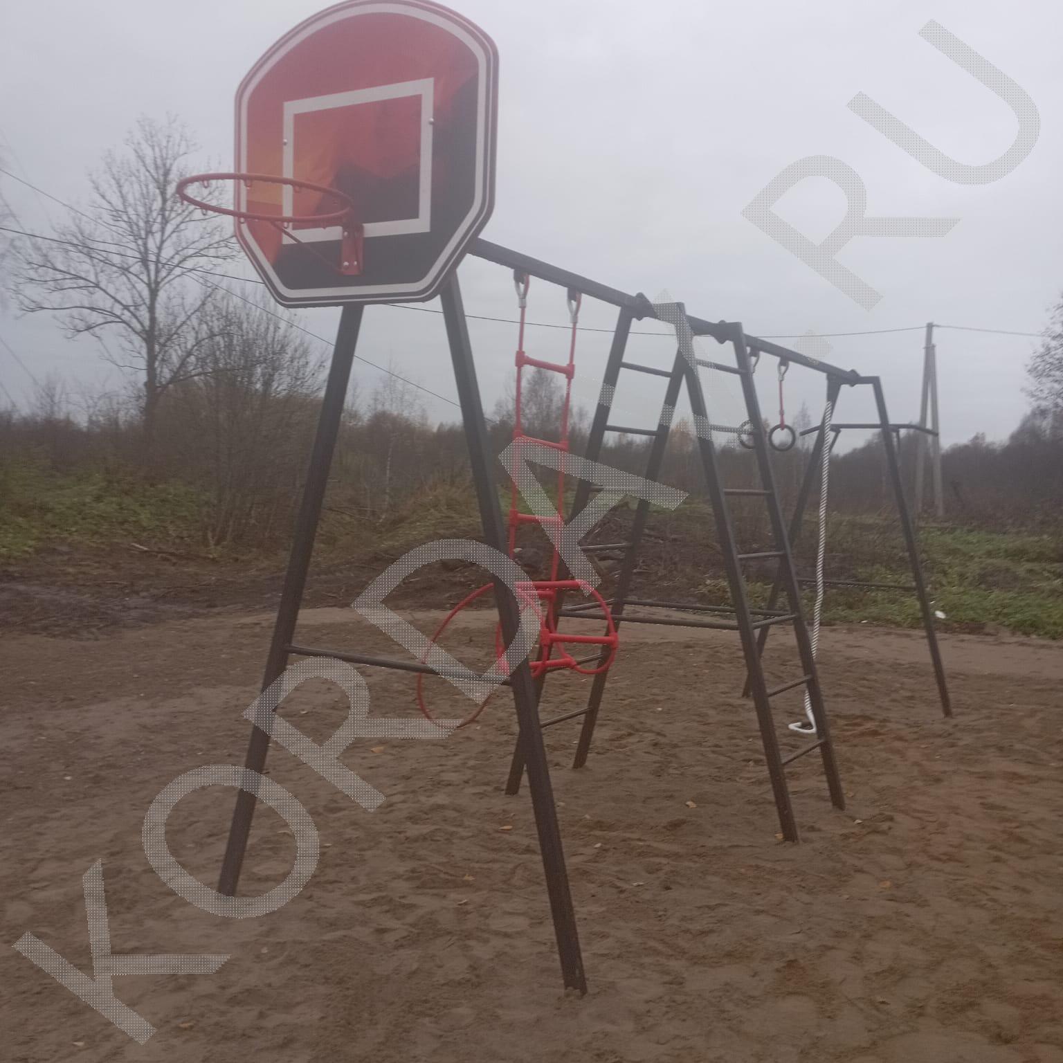 Для полноценной тренировки на спортивном комплексе установлены: гимнастические кольца на канатах (пара) и 1 канат, турник, две наклонные шведские лестницы, пластиковая лестница на канатах, щит баскетбольный с кольцом. Каркас конструкции прочный, сделан из профиля и стальных труб. Комплекс представляет собой сборную конструкцию, часть элементов которой соединены методом сварки, а часть — резьбовыми соединениями. Металлические части покрыты в 2 слоя порошковой краски, что обеспечивает увеличение срока эксплуатации конструкции в условиях переменчивых погодных условий. При монтаже опоры комплекса следует погружать на 0,5 м в бетонный фундамент.